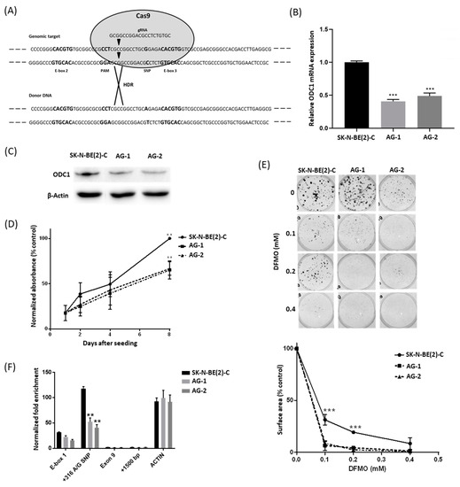 Analysis of AG clones generated from the GG SK-N-BE(2)-C cell line by CRISPR-Cas9 editing. (A) The CRISPR-Cas9 editing strategy was adopted to edit SK-N-BE(2)-C cells. The gRNA cleavage site (inverted triangles) is located 9 bp upstream of the G316A SNP. The donor DNA sequence carries the A SNP mutation (black). (B,C) ODC1 expression analysis by qRT-PCR (B) and Western blot (C) of CRISPR-edited clones AG-1 and AG-2, compared to parental SK-N-BE(2)-C cells. qRT-PCR data were normalized using GUSB as reference gene, and standardized as previously described [22]. Β-actin was used as the loading control for the Western blot. Uncropped WB images are available in Figure S10. (D) Proliferation rates of CRISPR-edited clones. Cell growth was measured by BrdU assay. Absorbance data were normalized to day 1 and SK-N-BE(2)-C was used as the control. (E) Analysis of the effect of DFMO on CRISPR-edited clones by clonogenic assay. The total area occupied by cell colonies was measured by crystal violet staining and subsequent ImageJ analysis. All p values were determined by one-way ANOVA tests and compared to SK-N-BE(2)-C as control. (F) ChIP analysis of H3-histone acetylation of the G316A SNP spanning region in the CRISPR-edited clones. The analyzed sequences in the ODC1 locus are E-box1, G316A SNP, Exon 9 and a sequence located +1500 bp downstream of the locus. Acetylation of a region in the Actin gene was used as a control. Enrichment data were normalized to a non-acetylated region located 15,000 bp upstream of the ODC1 locus. A representation of the analyzed region is shown in Figure S3A. ** p < 0.005, *** p < 0.001. All experiments were performed at least 3 times.