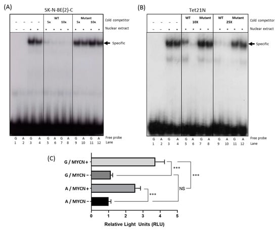 The effect of the ODC1 SNP on MYCN binding and ODC1 promoter activity. (A,B) MYCN binding was assessed using EMSA with SK-N-BE(2)-C (A) and Tet21N (B) nuclear extracts. Nuclear extracts were incubated in the presence of radiolabeled probes containing either the G SNP (G probe) or the A SNP (A probe), and E-box 3. Competition analysis was performed by incubating the binding reaction with 5–10-fold and 10–25-fold molar excess of unlabeled G probe carrying either a wild type (WT) or Mutant E-box. Quantification of the specific bands (arrow) is shown in Figure S4. Note that the order of the lanes differs between A and B. (C) Luciferase reporter assays in Tet21N cells transfected with a reporter plasmid containing a region of the ODC1 promoter that includes either the G or the A SNP. Untreated Tet21N cells with MYCN overexpression (MYCN+) were compared to tetracycline-treated cells (MYCN−), where MYCN overexpression is blocked. Replicates were standardized as previously described [22]. A two-way ANOVA was used to test for an interaction between the effects of the SNP and MYCN expression on promoter activity (SNP: F1,16 = 20.0, p < 0.001; MYCN expression: F1,16 = 203.4, p < 0.001; Interaction: F1,16 = 13.0, p = 0.002) followed by Tukey’s post-hoc test for multiple pairwise comparisons. A representation of all the constructs utilized for these experiments are shown in Figure S3B. *** p < 0.001.
