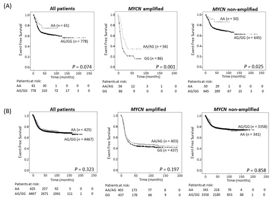 Event-free survival for the 839 neuroblastoma sample study cohort (A), and the 4892 patient GWAS cohort (B), grouped by genotype (AA vs. AA/AG for all patients and non-MYCN amplified patients, and AA/AG vs. GG for MYCN amplified patients).
