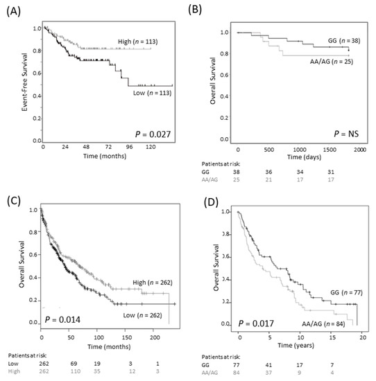 - Győrffy, B.; Surowiak, P.; Budczies, J.; Lánczky, A. Online survival analysis software to assess the prognostic value of biomarkers using transcriptomic data in non-small-cell lung cancer. PLoS ONE 2013, 8, e82241. [Google Scholar] [CrossRef]