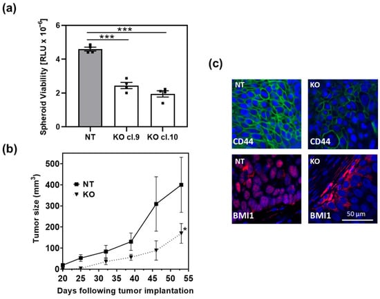 ARRB1 depletion affects spheroid formation and tumor growth: ARRB1 KO clones were established using the CRISPR/Cas9 technology as described previously [19]. (a) ARRB1-depleted HT1376 cells (KO cl.9 and KO cl. 10) and corresponding ARRB1 wild type controls (NT) were seeded at 2000 cells/well in 96-well plates for spheroid formation. Cells were placed on SeedEZ scaffolds to prevent attachment on plates and to allow spheroid formation as described in Material and Methods. The Cell Titer-Glo 3D Cell Viability assay was utilized to determine spheroid viability. Data: means ± SEM, n = 4; *** p < 0.001 (one-way ANOVA). (b) 1 × 106 ARRB1-depleted HT1376 cells (KO cl.10) (n = 6) and corresponding controls (NT) (n = 6) were transplanted subcutaneously in nude mice. Tumor growth was monitored weekly. Data: means ± SEM; * p = 0.0459 (two-way ANOVA). (c) Detection of CSC markers Bmi-1 and CD44 in ARRB1-KO HT1376 tumor xenografts and corresponding controls (NT) using immunofluorescence. Scale bar: 50 µm.