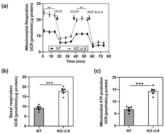 Depletion of ARRB1 alters mitochondrial respiration: (a) oxygen consumption rate (OCR) of ARRB1-depleted HT1376 cells (KO cl.9) and corresponding controls (NT) prior to and after injection of respiration modulators oligomycin (OLIG.), FCCP, and rotenone/antimycin A (ROT and A.A). Data: means ± SEM, n = 6; ** p < 0.01 (Two-way RM ANOVA). (b) Basal respiration in ARRB1-depleted HT1376 cells (KO cl. 9) and corresponding controls (NT). Data: means ± SEM, n = 6; *** p < 0.001 (two-tailed unpaired t test). (c) Mitochondrial ATP production in ARRB1-depleted HT1376 cells (KO cl. 9) and corresponding controls (NT) (calculated using the Seahorse XF Cell Mito Stress Test Generator). Data: means ± SEM, n = 6; *** p < 0.001 (two-tailed unpaired t test).