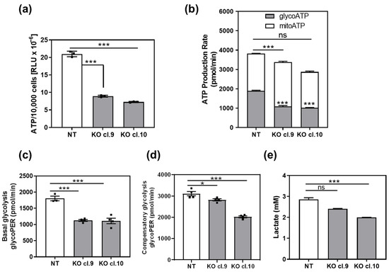 Depletion of ARRB1 decreases glycolysis and glycolytic ATP production rate: (a) total ATP per 10,000 cells in ARRB1-depleted HT176 clones (KO cl. 9 and cl.10) compared to control cells (NT). Data: means ± SEM, n = 3; *** p < 0.001 (One-way ANOVA). (b) Calculated glycolytic and mitochondrial ATP production rate in ARRB1-depleted HT1376 cells (KO cl. 9 and cl.10) compared to corresponding controls (NT). Data: means ± SEM, n = 3 or 4; *** p < 0.001 (glycoATP, KO vs. NT), *** p < 0.001 (mitoATP, KO vs. NT) (Two-way ANOVA). Total ATP: (NT vs. Cl.9, ** p < 0.01; NT vs. Cl.10, *** p < 0.001) (c) Basal glycolytic proton efflux rate (PER) in ARRB1 depleted HT1376 cells (KO cl. 9 and cl.10) compared to corresponding controls (NT). Data: means ± SEM, n = 3 or 4; *** p < 0.001, (One-way ANOVA). (d) Glycolytic proton efflux rate (glycoPER) following treatment with inhibitors of oxidative phosphorylation (Rotenone and Antimycin A). Data: means ± SEM, n = 4; * p < 0.05; *** p < 0.001 (one-way ANOVA). (e) Quantification of lactate secreted by ARRB1-depleted cells (KO cl. 9 and cl.10) and corresponding controls (NT). Data: means ± SEM, n = 7 or 8; *** p < 0.001 (One-way ANOVA).