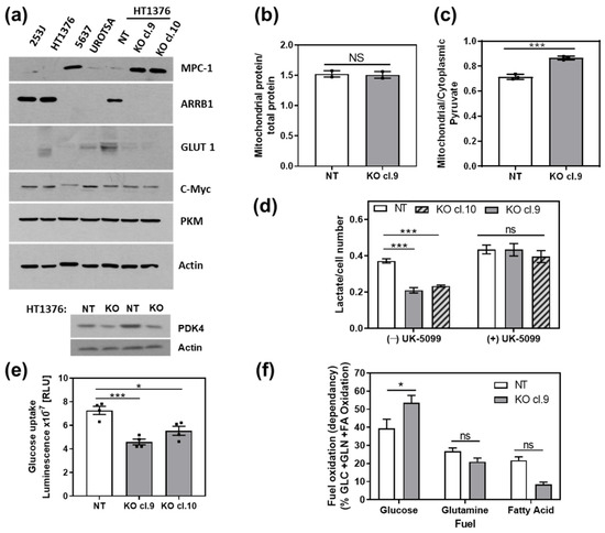 The depletion of ARRB1 (cl. 9, cl. 10) did not affect the expression of the glycolytic enzyme PKM and c-MYC, a transcription factor involved in glycolysis (Figure 4a). Furthermore, depletion of ARRB1 in HT1376 cells (KO cl.9 and 10) resulted in an abrogation of the glucose transporter GLUT 1 (Figure 4a). Moreover, ARRB1 KO cells showed reduced levels of pyruvate dehydrogenase kinase 4 (PDK4) (Figure 4a, lower panel). In conclusion, our results show that ARRB1 depletion decreases GLUT1 and PDK4 and induces MPC1 protein levels.