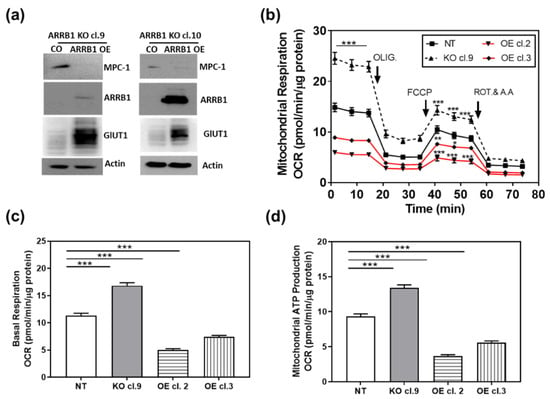 We performed proof-of-principle experiments and overexpressed ARRB1 in ARRB1-KO clones (Figure 5a). When ARRB1 was overexpressed, the phenotype was reversed and cells exhibited decreased expression of MPC1 (Figure 5a and Figure S3). In parallel experiments, we over expressed ARRB1 in ARRB1 KO cells (cl. 9) and generated stable clones overexpressing ARRB1 (OE cl.2, cl. 3). We then analyzed mitochondrial respiration in those clones (Figure 5b). ARRB1 KO clones (cl. 9) showed increased mitochondrial respiration compared to NT controls (Figure 2a and Figure 5b). The overexpression of ARRB1 in ARRB1 KO cells (OE cl.2, cl.3) reduced mitochondrial respiration/oxygen consumption. Similarly, Figure 5c,d show reduced basal respiration and mitochondrial ATP production, respectively, when ARRB1 is re-expressed in ARRB1 KO cells. In conclusion, ARRB1 depletion results in metabolic reprogramming towards mitochondrial respiration/oxidative phosphorylation. However, the metabolic preference is restored when ARRB1 is re-expressed.