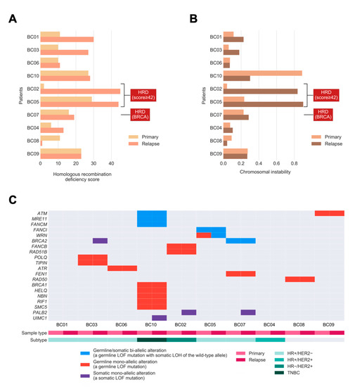 In this study, we observed that four out of 10 patients had a notably increased HRD score in their relapsed tumors, compared to matched primary ones. Among these patients, there were two relapsed tumors with an HRD score ≥42 that could be treated and might have a predictive response to PARP inhibitors and platinum-based agents [17,30,32]. In the other two cases, such treatment might also be the potential therapeutic avenue, particularly in the case of BC03 with the somatic BRCA2 mutation. Patient BC07 with HRD phenotype harboring the bi-allelic BRCA2 alteration could also be considered for these treatments. However, the efficacy of PARP inhibitors and platinum compounds was unclear in these two patients with an HRD score <42.