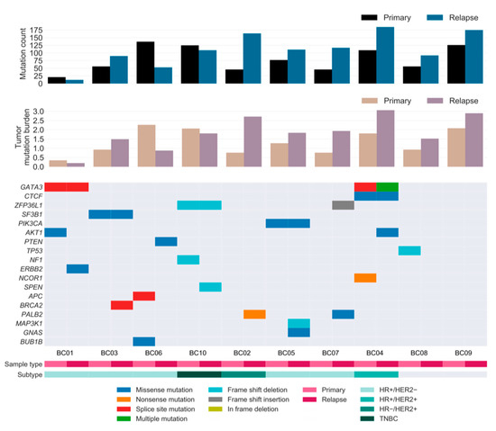 To investigate the landscape of driver mutations from primary tumor until relapse, we manually curated the BC driver genes known to contain single nucleotide variations (SNVs) and insertions/deletions (INDELs) as reported in previous studies [6,8,21,22,23]. A total of 11 and 13 cancer genes were identified as drivers in the primary and relapsed samples, respectively, of which six genes were present in both samples (Figure 3). Mutations in well-known BC genes, such as PIK3CA and CTCF, were found in both primary and relapsed lesions, along with GATA3, which was more recurrently present in these lesions. Notably, mutations in CTCF and ERBB2 were hotspot sites of BC, as has previously been associated with endocrine resistance [24]. PI3K signaling (PIK3CA, AKT1, and PTEN) was found to be frequently altered compared to other pathways in our cohort, followed by receptor-tyrosine kinase-Ras (RTK-RAS; NF1 and ERBB2) and Notch signaling (NCOR1 and SPEN) genes. Among these, most driver mutations were specific to either the relapsed tumor or the matched primary tumor, implying that there is typically genomic divergence between primary and relapsed lesions. Moreover, eight out of 10 patients acquired one or two additional driver mutations specific to the relapse sample, suggesting that the growth of the relapsed clone in its new architecture is abetted by further tumor progression, especially in lesions with HRD.