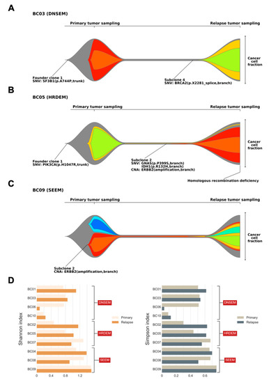 Clonal architecture of primary and relapsed tumors, and indices of subclonal diversity. Fishplots indicate the clonal composition and the potential clonal selection during progression of primary tumors to relapse from three patients ((A) BC03; (B) BC05; and (C) BC09). Each plot was derived from somatic single nucleotide variations (SNVs), insertions/deletions, and copy number alterations (CNAs) using PhyloWGS. The founder clones are shown in gray, while subclones are shown in other colors. Key alterations in the founder clone and subclones are highlighted, with mutations in driver genes identified at both the clonal and subclonal level. Tumors with the homologous recombination deficiency phenotype are also annotated. The cancer cell fraction of each clone could be inferred at the time of primary and relapse sampling. Three major models of clonal architecture from primary lesion to relapse were identified (DNSEM: de novo subclone evolution model; HRDEM: HRD evolution model; and SEEM: selective expansion evolution model). (D) Bar charts showing the subclonal diversity in relapsed tumors versus primary breast tumors, derived from two indices (left: Shannon index; and right: Simpson index).