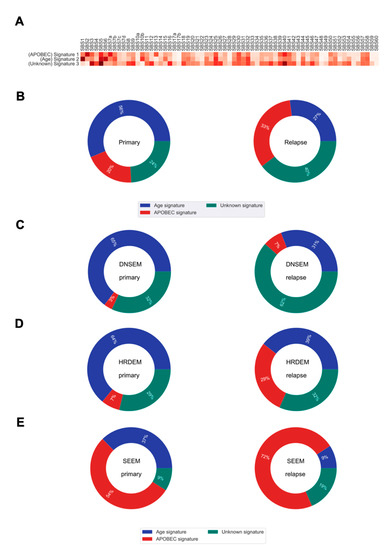 The mutational signatures and their contributions to somatic mutations in primary and relapsed tumors. (A) Heatmap of the cosine similarity results for the three de novo single base substitution signatures of our cohort (y-axis), coded by color. The cosine similarity (range 0–1) represents the extent of similarity to a particular signature of the Catalogue Of Somatic Mutations In Cancer (COSMIC) (x-axis). Among the 65 COSMIC mutational signatures, the age and apolipoprotein B mRNA editing enzyme, catalytic polypeptide-like (APOBEC) signatures were the most similar mutational signatures detected in both primary and relapsed tumors (dark red), while one signature was recorded as unknown etiology in the COSMIC database. (B) Pie charts show the percentage of mutations derived from each signature, for both the primary and relapse cancer cohorts. (C–E) Pie charts show the percentage of mutations derived from each signature for each of the three evolution models from primary tumor to relapse. DNSEM: de novo subclone evolution model; HRDEM: HRD evolution model; and SEEM: selective expansion evolution model.