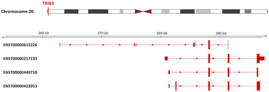 Transcript variant analysis of the TRIB3 gene (ENSG00000101255.11). (Adapted from the Ensembl platform; https://www.ensembl.org accessed on 6 January 2021).