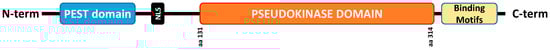 The N-terminal domain contains a large amount of proline (P), glutamic acid (E), serine (S), and threonine (T) residues. Such PEST regions are involved in Ubiquitin-mediated degradation of a variety of substrates, thus controlling the half-life of target proteins [16,17]. A nuclear localization signal (NLS) sequence allows TRIB3 to localize to the nucleus where it interacts with various transcription factors such as ATF4, CHOP, C/EBPβ, PPARγ, p65/RelA, or SMAD3. The C-terminal domain of TRIB3 contains two conserved sequences: Mitogen Activated Protein Kinase Kinase (MEK1/MAPKK) binding motif and Constitutive Photomorphogenesis Protein 1 Homolog (COP1) binding motif recognized by this subclass of E3 ubiquitin ligase.