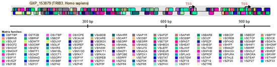 In silico analysis of the human TRIB3 promoter region using the MatInspector Software (Genomatix Software GmbH, Munich; version v3.13). The matching transcription factor binding sites with a 5′ to 3′ (above the line) or a 3′ to 5′ (below the line) orientation relative to the transcription start site (TSS) are indicated.