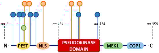 TRIB3 post-translational modifications. Phosphorylation (blue circle), ubiquitylation (orange circle), and methylation (green circle) sites reported from www.phosphosite.org accessed on 18 June 2020).