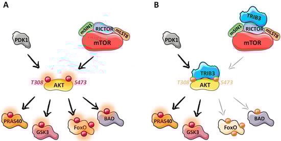 Thanks to its C-term MEK1-binding domain, TRIB3 is able to deactivate multiple mitogen-activated protein kinases (MAPKs). In fact, the best-described function of TRIB3 is the negative regulation of Akt (thymoma viral proto-oncogene/protein kinase B) activity (Figure 6). The PI3K/Akt signal transduction pathway is pivotal for cell response to various extracellular stimuli. Active Akt plays a pro-survival role thanks to its multifunctional downstream signaling nodes. However, its effective activation requires phosphorylation on two key residues, namely, Thr308 and Ser473. Firstly, PI3K (phosphoinositide-3-kinase) activates PDK1 (Pyruvate Dehydrogenase Kinase 1), which phosphorylates AKT at Thr308. Then, for optimal activation, mTORC2 phosphorylates Akt on Ser437 [37]. Several evidence suggest that TRIB3 disrupts the phosphorylation at both Thr308 and Ser473 residues through a direct interaction with Akt [38]. In addition, TRIB3 can inhibit the Akt phosphorylation at Ser473 by binding to the mTORC2 component, RICTOR [39]. The TRIB3-mediated Akt inhibition does not inhibit all Akt substrates in the same way, which is an additional testament for its context-dependent regulation. For instance, FoxO and BAD phosphorylation is impaired, whereas GSK3β and PRAS40 phosphorylation remains intact.