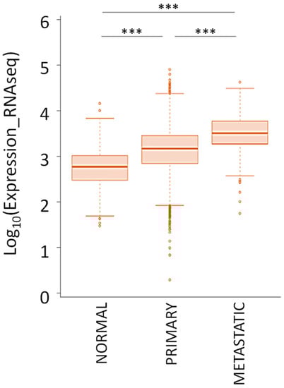 In the context of genetic alterations, two different studies reported a copy number gain for the TRIB3 locus in 16% and 40% of patients [58,59]. As a result, the colorectal, liver, and lung cancer exhibit higher TRIB3 mRNA level as compared with non-tumor sample. In accordance, data from TCGA confirm that TRIB3 mRNA expression is higher in the tumor tissues compared to the normal tissues (Figure 8). In addition, TRIB3 expression is even higher in metastatic lesions compared to primary tumors.
