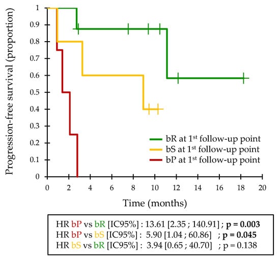 Patients with an initial bP had a significantly lower PFS than bR patients (HR = 13.61; 95%CI = [2.35–140.91]; p = 0.003; Figure 1) and bS patients (HR = 5.90; 95%CI = [1.04–60.86]; p = 0.045). The difference in PFS between bR and bS patients was not significant.