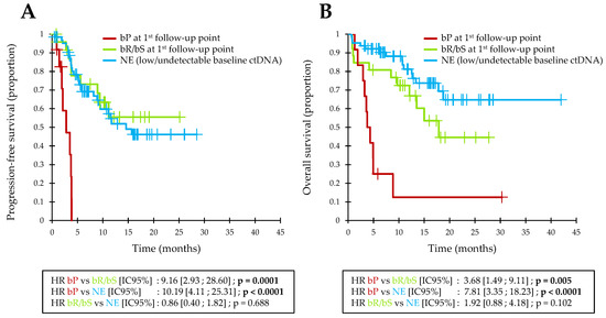 Kaplan–Meier estimates of PFS (A) and OS (B) in pooled analysis, depending on baseline ctDNA and biological response assessment at the first follow-up point.