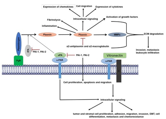 Overall, the interpretation of the role of the plasminogen activation system in tumor progression has been more complicated than expected due to the multifunctionality of the components and their plasmin-independent role in tumor progression. For instance, plasmin apart from its enzymatic function also promotes cell signaling which potentially contributes toward tumor growth and metastasis. uPAR is a pleiotropic protein that regulates cell adhesion, migration, proliferation, via intracellular signaling and independent of its plasmin activating function.