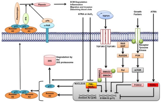 Regulation of S100A10 (p11): P11 is transactivated by (1) the promyelocytic leukemia-retinoic acid receptor alpha (PML-RARα) fusion oncoprotein, (2) TGFβ1-dependent activation of the SMAD pathway, and (3) oncogenic RAS-mediated activation of the Ral-GDS/Ral pathway. Conversely, transcriptional repression of P11 is mediated by (1) ATRA- and arsenic trioxide (AsO3)-induced degradation of the PML-RARα fusion oncoprotein, (2) growth factor-induction of the PI3K/mTOR pathway and consequent FOXC2-dependent transcriptional repression of p11, and (3) ATRA-activation of RARα. Newly transcribed p11 and p36 (Annexin A2) proteins rapidly form the AIIt heterotetramer complex within the cytoplasm prior to being transported to the cell surface. Although the p11–p36 interaction protects p11 from degradation by the 26S proteasome, ATRA and AsO3 both induced the ubiquitin-independent degradation of p11 by the 20S proteasome. Once at the cell surface, AIIt acts as a dual receptor for plasminogen and tissue plasminogen activator (tPA) and co-localizes with and urokinase-type-plasminogen activator/uPAR complex. By localizing plasminogen and its activators, AIIt catalyzes the cleavage of plasminogen to produce plasmin, a serine protease involved in ECM degradation, inflammation, cellular migration an invasion, and blood clot dissolution.