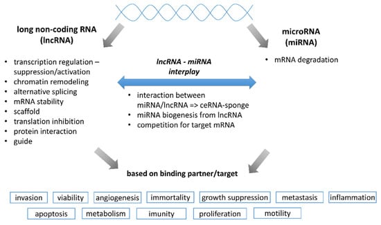 lncRNAs, defined as transcripts longer than 200 nucleotides without protein-coding function, also have predominantly regulatory functions and exhibit highly tissue- and organ-specific expression patterns. The main mechanisms of function include regulation of transcription by interaction with coding and non-coding RNAs, proteins, chromatin, or recruitment of transcription factors. Moreover, lncRNAs affect mRNA stability, splicing, and translation processes. By interaction with protein partners, they influence their function and localization [105,106,107,108,109]. Besides interactions with protein-coding genes or proteins, lncRNAs interact with miRNAs as competing endogenous RNA (ceRNA) or “RNA sponges” and thus impose their regulatory effect on specific targets [110]. The regulatory function of lncRNAs influences many cellular processes such as proliferation, cell growth, viability, immortality or angiogenesis, and metastatic process.