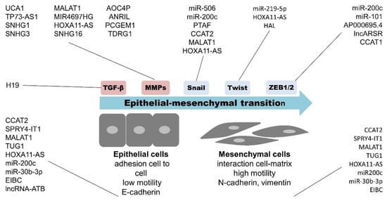 Schematic representation of ncRNA influencing epithelial–mesenchymal transition (EMT) process in OC. This chart shows ncRNAs elements—miRNAs and lncRNAs, which associate with EMT regulation. During EMT, adherent epithelial cells are changed to highly motile mesenchymal cells, capable of invading other places in human body. Few key molecules, i.e., E-cadherin, N-cadherin, and vimentin, whose expression is regulated by miRNAs and lncRNAs, characterize this process. Several ncRNAs regulate/interact with EMT-transcription factors (Snail, Twist, and ZEB families) and thus affect the EMT process. Other key players in EMT regulated by ncRNA are metalloproteinases (MMPs) and TGF-β.
