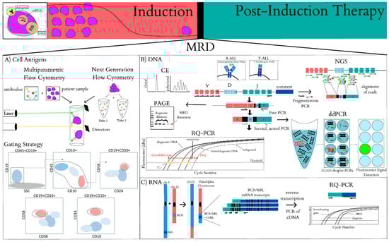 Methods of detection for MRD. (A): Representative schematic of multiparametric flow cytometry detection of the leukemia-associated immunophenotype. Antibodies conjugated to individual fluorochromes are incubated with the patient sample, either using 4-5 colors for traditional methods, or 8 colors (targeting 10 different antigens) in two separate tubes with next generation flow cytometry. Schematic example showing a gating strategy of a post induction sample analyzed with an informative antibody panel that allows the identification of residual leukemic blasts by deviation from normal lymphoid progenitors based on lineage and maturational stage. Examination of this CD45dimCD19+CD10+ population reveals blasts that are CD58+CD24+CD38dimCD33+. (B): MRD detection using DNA as a substrate for targeting the immunoglobulin heavy chain (IgH) for B-ALL or the T cell receptor (TCR) for T-ALL. Black boxes between V(D)J segments represent patient specific rearrangements formed during V(D)J recombination. Five representative schematics contrasting the assays utilizing this target, counterclockwise: capillary electrophoresis (CE), polyacrylamide gel electrophoresis (PAGE), real time quantitative polymerase chain reaction (RQ-PCR), digital droplet polymerase chain reaction (ddPCR) and next generation sequencing (NGS). (C): MRD detection using RNA as a substrate to track chromosomal translocations. An example is shown for the reciprocal translocation of t(9;22)(q34;q11) that results in the BCR/ABL oncogene.