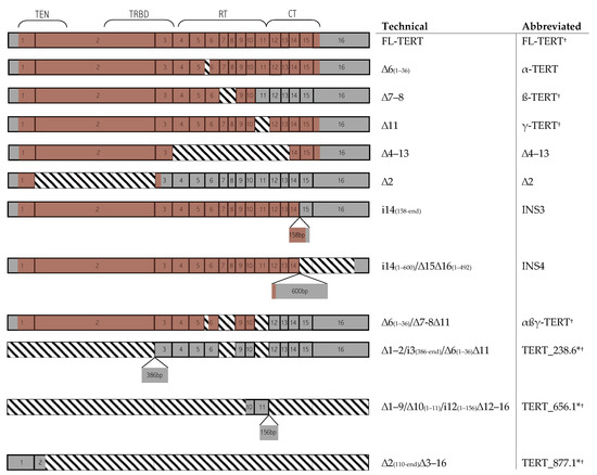 mRNA structure of commonly investigated TERT isoforms and those annotated in Ensembl Build 93. Full-length (FL)TERT consists of 16 exons that make up four domains: TEN, TRBD, RT, and CT. Splicing can involve deletions, which are marked with downward diagonal stripes; or insertions, which are marked with smaller boxes indicating insertional size and an arrowhead indicating the insertional point. ORFs are shown with a light red shade layered over the mRNA structure. Technical isoform name terminology includes “∆” representing deletions and “i” representing insertions. * Abbreviated names are taken from Ensembl transcript ID (TERT_238.6—ENST00000484238.6; TERT_656.1—ENST00000503656.1; TERT_877.1—ENST00000522877.1). † Indicates transcripts annotated in Ensembl Build 93. All Ensembl transcripts are either automatically generated from the Ensembl genebuild pipeline or manually annotated by human and vertebrate analysis and annotation (HAVANA), supported by transcriptional evidence either from complementary DNA, expressed sequence tags, or protein sequences. Telomerase essential N-terminal domain (TEN); Telomerase RNA binding domain (TRBD); C-terminal extension domain (CT); Central catalytic reverse transcriptase domain (RT); Open-reading frame (ORF).