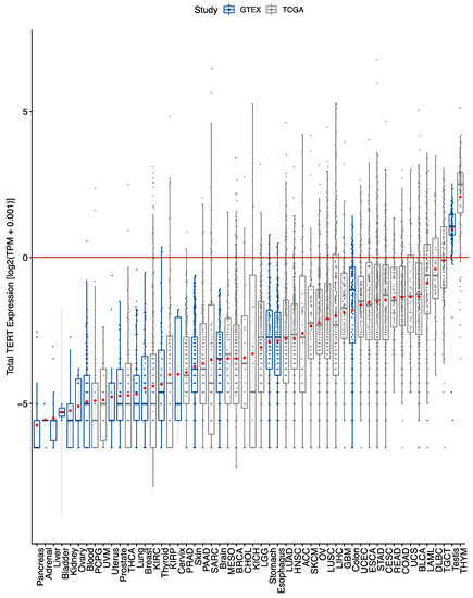 Variable total TERT expression observed across tumour and normal tissue types. Total TERT expression across TCGA tumours shows tumour-specific expression. Total TERT expression across GTEx normal tissue types shows the majority have low expression except for gastrointestinal and testicular tissue types. Box plots boxes denote the inter-quartile range as well as a bolded line representing the median. Extending from the boxes are minimum and maximum lines calculated from 1.5 times the interquartile range. Points outside this range are considered outliers. Within each box is a red point signifying the mean, as well as lines extending from this point representing a 95% confidence interval. Expression values in transcript per million (TPM) were transformed by a log2(TPM + 0.001) equation. Horizontal line at y = 0 indicates 1 TPM.