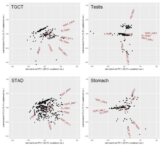 Expression relationships between TERT isoforms differ between tissue types and when in the neoplastic state. PCA biplots for testicular germ cell tumours (TGCT), stomach adenocarcinoma (STAD), and their respective matched normal tissues are shown as examples. Plotted using the first two principal components and show the loading vectors (arrows) of each TERT isoform variable expressed. The arrow length approximates the variance of the variable. The angle between arrows approximates the correlations between variables. Such that parallel arrows in the same direction have positive correlations, perpendicular arrows have no/weak correlations, and parallel arrows in the opposite direction have negative correlations.