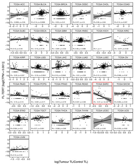 Comparing telomerase activity gene signature expression to TERT_238.6 isoform percentage found significant negative correlations in 14/33 (~42%) cancer types (Figure 4), aligned with previous findings of TA inhibition by β-deleted TERT isoforms [32,33]. Finally, comparing TERT isoform expression with relative telomere length, a surprising significant negative correlation between FL-TERT expression in sarcomas was found (Figure 5). Interestingly, TGCT and THYM had significant positive correlations between telomere length and TERT_238.6 expression, but not with FL-TERT expression (Figure S7). Seeing as these cancer types had the highest total TERT expression and TERT_238.6 was the predominant isoform in most samples, this relationship may simply be reflecting one of total TERT expression and telomere re-lengthening. No other correlations between TERT isoform expression and relative telomere length were observed (Figures S7–S12).