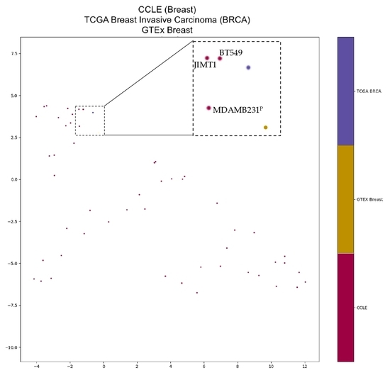 - Yu, K.; Chen, B.; Aran, D.; Charalel, J.; Yau, C.; Wolf, D.M.; van ’t Veer, L.J.; Butte, A.J.; Goldstein, T.; Sirota, M. Comprehensive transcriptomic analysis of cell lines as models of primary tumors across 22 tumor types. Nat. Commun. 2019, 10, 3574. [Google Scholar] [CrossRef] [PubMed]
