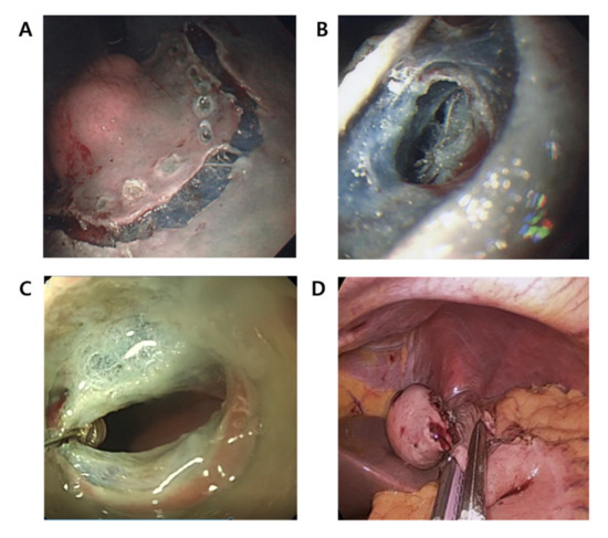 - Matsuda, T.; Nunobe, S.; Kosuga, T.; Kawahira, H.; Inaki, N.; Kitashiro, S.; Abe, N.; Miyashiro, I.; Nagao, S.; Nishizaki, M.; et al. Laparoscopic and luminal endoscopic cooperative surgery can be a standard treatment for submucosal tumors of the stomach: A retrospective multicenter study. Endoscopy 2017, 49, 476–483. [Google Scholar] [CrossRef] [PubMed]