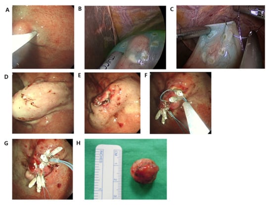 - Kanehira, E.; Kanehira, A.K.; Tanida, T.; Takahashi, K.; Obana, Y.; Sasaki, K. CLEAN-NET: A modified laparoendoscopic wedge resection of the stomach to minimize the sacrifice of innocent gastric wall. Surg. Endosc. 2020, 34, 290–297. [Google Scholar] [CrossRef] [PubMed]