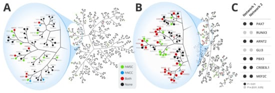 Tree-and-leaf representation of Ewing Sarcoma regulatory networks and methylation profile. Regulatory networks 1 (A) and 2 (B) inferred from ES datasets GSE34620 and GSE63157, respectively. Nodes represent regulatory units (regulons) labeled by their transcription factors, and edges represent their relationship as the overlap of mutually regulated genes. Network nodes are colored according to the master regulator analysis (MRA) results, carried out with the disease signatures obtained with hMSC and hNCC as ES cells of origin. Methylation profile (C) of the seven regulons composing the intersection of both networks (networks 1 and 2), and both signatures (hMSC and hNCC). The color code in C represents methylation p-value as indicated.