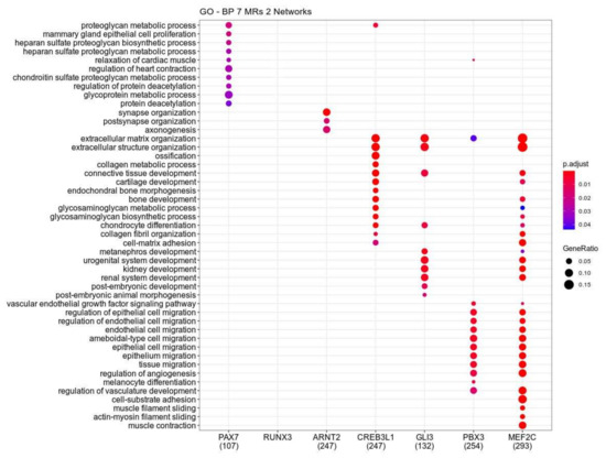 To perform the functional enrichment of the genes regulated by the seven master regulators (MRs), we considered collectively the genes associated with each MR in both networks 1 and 2. According to Figure 2, PAX7 regulated genes are associated with glycoprotein metabolic process, proteoglycan metabolism, and protein deacetylation. There are no biological functions significantly enriched for RUNX3 regulated genes, while ARNT2 associated genes are involved with synapse and postsynapse organization, and axogenesis. The regulons CREB3L1, GLI3, PBX3, and MEF2C share biological functions, mainly functions involved with extracellular matrix dynamics. For example, the GO term extracellular matrix organization is enriched in those four regulons. GO terms extracellular structure organization, connectivity tissue development, and chondrocyte differentiation are enriched in regulons CREB3L1, GLI3, and MEF2C, while MRs PBX3 and MEF2C regulates genes involved with endothelial and epithelial cell migration.