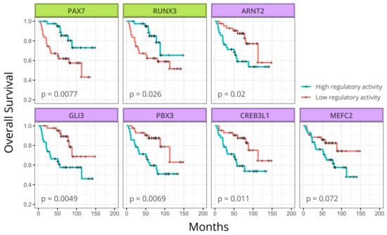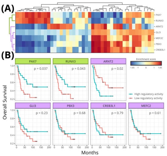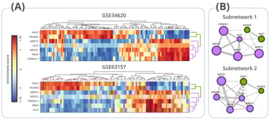 Figure 3A shows the heatmaps involving the activity of the seven MR for the 117 samples used to infer network 1 (GSE34620) and the 85 samples used to infer network 2 (GSE63157). In both heatmaps, it is possible to observe two clusters: one formed by regulons PAX7 and RUNX3 and another formed by regulons ARNT2, CREB3L1, GLI3, MEF2C, and PBX3. The regulatory activity of these two clusters is antagonistic to each other in both cohorts: in general, patients with high RUNX3 and PAX7 regulon activity have low ARNT2, CREB3L1, GLI3, MEF2C, and PBX3 regulon activity and vice-versa (Figure 3A). Figure 3B shows two subnetworks extracted from the regulatory networks 1 and 2. Both subnetworks include only the seven regulons used for heatmap analyses (Figure 3A). Similar to Figure 1, the network is depicted according to regulon overlapping (i.e., according to genes mutually regulated), but here the edges indicate whether each pair of transcription factors regulates the shared genes in the same direction (agonistic regulation) or in the opposite direction (antagonistic regulation). As seen in Figure 3B, it is possible to observe two groups of regulons. PAX7 and RUNX3 regulate shared genes in the same direction. Similarly, the group formed by ARNT2, CREB3L1, GLI3, MEF2C, and PBX3 regulates the shared genes in the same direction (Figure 3A and Figure A4 and Figure A5). However, transcription factors of different groups always regulate simultaneously regulated genes in the opposite direction (Figure 3B). According to Figure 3, regulons PAX7 and RUNX3 are simultaneously activated or inhibited and act coordinately by regulating shared genes in the same direction. The same occurs among regulons ARNT2, CREB3L1, GLI3, MEF2C, and PBX3. Moreover, both groups seem to work as antagonists between each other.