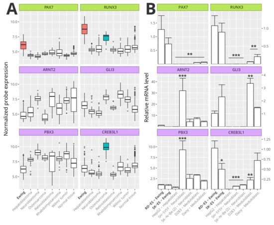 Ewing Sarcoma Master Regulators Expression. The boxplots (A) show the expression of the six ES master regulators significantly associated with patient outcome (PAX7, RUNX3, ARNT2, GLI3, PBX3, and CREB3L1). The expression of each MRs was assessed in biopsies from ES (N = 117), Hepatoblastoma (N = 55), Neuroblastoma (N = 88), Osteosarcoma (N = 21), Retinoblastoma (N = 20), Rhabdomyosarcoma (N = 58), Wilm’s tumor (N = 53) and a dataset from 65 different healthy tissues as control (N = 353). Colored boxes indicate the group was significantly different compared to all the other groups (Pairwise Wilcox test with Bonferroni correction, p < 0.05). Bar plots (B) represent the relative expression measured by RT-qPCR of the indicated MRs in different cell lines originated from ES and other pediatric tumors. The differences are always related to RD-ES cell line (* p < 0.05, ** p < 0.01, *** p < 0.0001).