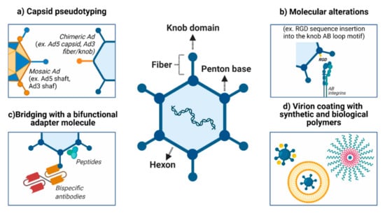 Although Ads infect many different types of cells, low (or no) expression of CAR, especially in tumor cells, confounds the attachment step and represents one of the hurdles to gene therapy using adenoviral vectors. Several strategies have been employed to overcome this barrier and redirect the Ads to the intended recipient and, consequently, decrease off-target effects (Figure 1).