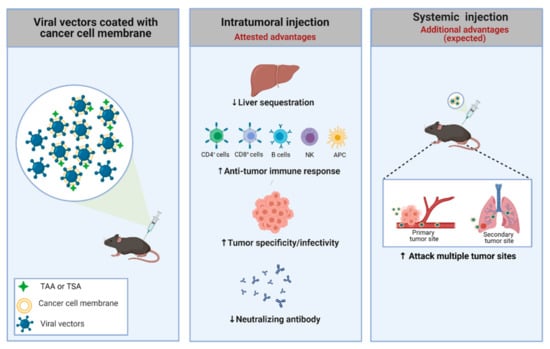 Strategy used to improve the specificity of adenoviral vectors. An adenovirus coated with a cancer cell membrane has some advantages, such as the presence of TSA and TAA, which aids the anti-tumor immune response. Additionally, the membrane can be engineered to present specific molecules/receptors, improving the power of interaction with the tumor. Moreover, the viral coating can offer several benefits, including suppression of liver toxicity, increase of specific infectivity to cancer cells, preferential antitumor (not antiviral) immune response, and escape from pre-existing neutralizing antibodies in both routes of delivery (intratumoral and systemic). Systemic administration using virus coated with membranes could offer a highly desirable outcome: targeting metastatic foci. TAA: tumor-associated antigens; TSA: tumor-specific antigens. Created with BioRender.com.