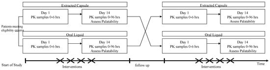 The present study investigated the PK characteristics of the novel oral liquid formulation of 13-CRA and capsule-extracted 13-CRA. The model estimated a 65% higher mean bioavailability for the oral liquid and implies a marked improvement in dose delivery. Previous studies have also shown that children able to chew and/or swallow intact 13-CRA capsules are significantly more likely to achieve target concentrations than those who have the drug extracted from capsules prior to administration. Veal et al. (2013) observed a significantly higher mean (SD) Cmax value of 1200 (660) ng/mL in patients who swallowed capsules as compared to 780 (545) ng/mL in patients who required the drug to be extracted prior to administration (p = 0.0012) []. They also noted that a target Cmax of 600 ng/mL was achieved by 93% (25/27) versus 55% (42/76) of patients in the two groups, respectively. In the present study, 80% (16/20) of patients exceeded a Cmax of 600 ng/mL with the oral liquid, compared to 45% (9/20) of patients with the capsule-extract method. Similarly, Gota et al. (2016) also showed that children who swallowed intact 13-CRA capsules (n = 18) achieved higher AUC0–6h values compared to those who could not (n = 16); mean AUC 6470 vs. 2810 ng/mL·h (p < 0.05) []. Cho et al. (2017) assessed the PK of 13-CRA and 4-oxo-13-CRA (thought to be equally pharmacologically active) in Children’s Oncology Group (COG) phase III studies that treated HRNBL patients with 13-CRA and immunotherapy []. Of 617 patients, 370 (60%) achieved median combined plasma concentrations of 13-CRA + 4-oxo-13-CRA >1500 ng/mL. Plasma levels were higher in patients taking intact capsules relative to open capsule takers (13-CRA: 522 vs. 310, 4-oxo-13-CRA: 2160 vs. 990 ng/mL, respectively, p < 0.001).