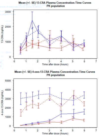 Mean (SE) plasma concentration versus time profiles for 13-cis-retinoic acid (13-CRA) (upper panel) and 4-oxo-13-CRA (lower panel). Blue lines are oral liquid, red lines are extracted capsule. Continuous lines are Day 1, interrupted lines are Day 14.