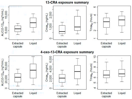 The plots above compare the individual model-predicted AUC(0-12)ss, Cmaxss and Tmaxss (left-to-right) of 13-CRA (upper panel) and 4-oxo-13-CRA (lower panel). Individual values are summarized as vertical box-and-whisker plots, with the box covering the interquartile range (IQR), the median shown by the thick black line and with whiskers extending to 1.5 times the IQR.
