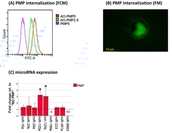 Internalization of platelet microparticles (PMPs) in THP-1 cells after 18 h of co-incubation. (A) Transfer of acridine orange from stained PMPs analyzed by flow cytometry (FCM). Histogram plot from a representative experiment (n = 2). Number following different PMP groups denotes the final concentration in million PMPs per mL medium. AO, acridine orange. (B) Transfer of acridine orange from stained PMPs analyzed by fluorescence microscopy (FM) at 400× magnification. (C) Changes in levels of microRNAs (n = 3). microRNA data were calculated as fold change from THP-1 without PMP co-incubation, normalized for BCR. p values were calculated using the one-sample t test. * p < 0.05. #, fold change was not calculated as levels were undetectable in 2/3 replicates for THP-1 without PMP co-incubation. ND, not detected.