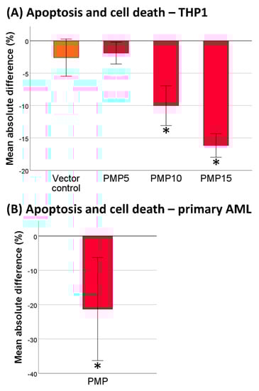 Apoptosis and cell death in THP-1 and primary acute myelogenous leukemia (AML) cells treated with 0.5 µM daunorubicin. (A) Difference in frequency of dead and apoptotic cells in THP-1 cells with or without co-incubation with platelet microparticles (PMPs) (n = 3). Number following different PMP groups denotes final concentration in million PMPs per mL medium. (B) Evaluation of the effect of PMPs on the frequency of dead and apoptotic cells in primary AML cells (nine patient samples, n = 4). p values were calculated using the one-sample t test (test value = 0). * p < 0.05.