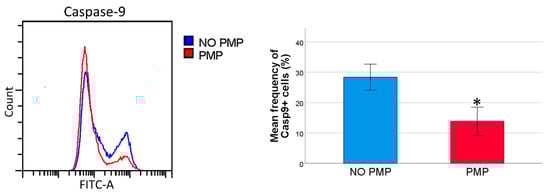 Using microRNA databases (miRDB [36] and TargetScanHuman [37]), we found several predicted target mRNAs for miR-125a-5p and miR-125b-5p with important roles in the intrinsic apoptotic pathway, such as the pro-apoptotic BCL2 family proteins, BCL2 Modifying Factor (BMF) and BAK1 [38]. To investigate whether PMP internalization could influence the intrinsic apoptotic pathway, THP-1 cells were co-incubated with PMPs and treated with DNR using the established approach. Then, the cells were analyzed for caspase-9 activation, which is a downstream effect of mitochondrial outer membrane permeabilization (MOMP). There was a lower frequency of caspase-9 positive cells in the THP-1 cell cultures co-incubated with PMPs (Figure 3), suggesting that the chemoprotective effect of PMPs could be the result of the effects on the intrinsic apoptotic pathway upstream of caspase-9 activation.