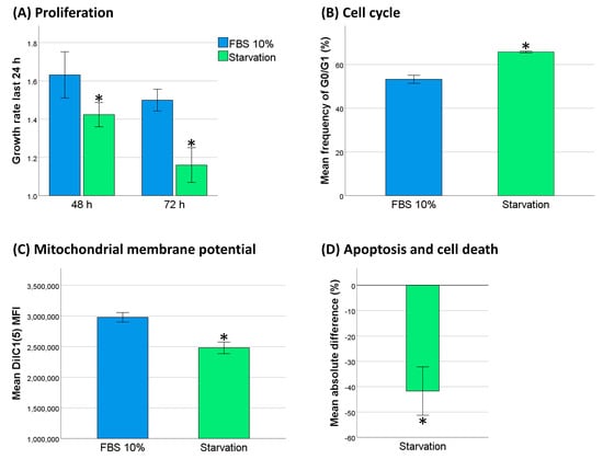 Effects of serum starvation on cell activity and daunorubicin (DNR)-resistance in THP-1 cells. (A) Daily proliferation rate analyzed by flow cytometric counting (n = 4). (B) Cell cycle analysis after 48 h of serum starvation (n = 3). Cells in the G0/G1 cell phase were gated. (C) Mitochondrial membrane potential after 48 h of serum starvation (n = 3), mean fluorescence intensity (MFI) data. (D) Difference in DNR-induced cell death and apoptosis after 48 h of serum starvation compared to standard conditions. (A–C) were compared using the paired-sample t test. (D) was compared using the one-sample t test (test value = 0). * p < 0.05.