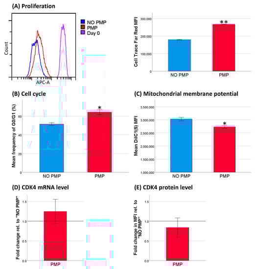 Effects of platelet microparticles (PMPs) on cell activity in THP-1 cells. (A) Proliferation analysis by Cell Trace Figure 5. (n = 5). (B) Cell cycle analysis (n = 3). Cells in G0/G1 cell phase were gated. (C) Mitochondrial membrane potential (n = 4), mean fluorescence intensity (MFI) data. (D) CDK4 mRNA levels (n = 3). (E) CDK4 protein levels (n = 5). (B–E) were analyzed after 24 h of PMP co-incubation. mRNA data are calculated as fold change from THP-1 without PMP co-incubation, normalized for ACTB. Protein data are calculated as fold change in MFI from THP-1 without PMP co-incubation. Data were compared using the paired-sample t test for data pairs or the one-sample Wilcoxon signed-rank test for ratios. * p < 0.05. ** p < 0.001.