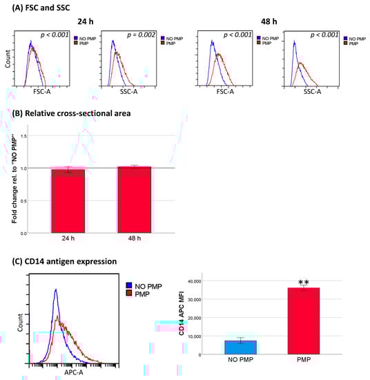 Phenotypical changes induced by platelet microparticles (PMPs) co-incubation. (A) Forward scatter (FSC) and side scatter (SSC; n = 4). (B) Ratio of cell cross-sectional area (n = 4). (C) CD14 antigen expression after 48 h of culture (n = 5). Data were compared using the paired-sample t test for data pairs or the one-sample t test for ratios. ** p < 0.001.