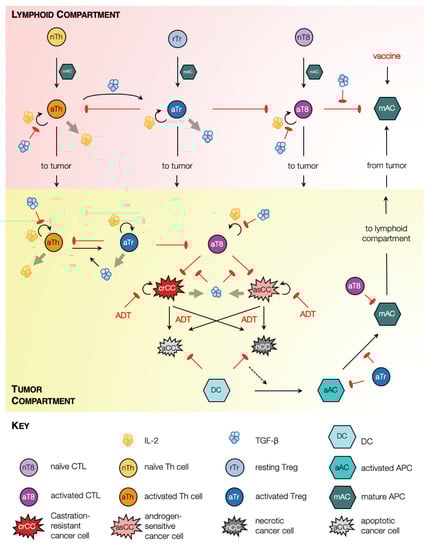 The effects of ADT and vaccination with sipuleucel-T are incorporated as follows. Under ADT, androgen sensitive cancer cells cease to proliferate and undergo cell death primarily via apoptosis, although some cells may undergo necrosis or necroptosis []. Castration resistant cancer cells are assumed to be dependent on androgens to a far lesser extent; consequently, their proliferation rate may slow down under ADT, and limited cell death may be induced. Under vaccination, mature APCs are injected into circulation, from where they may undergo clearance or accumulate in highly vascularized organs such as the spleen []. Once in the spleen, the mature APCs are presumed to trigger an anti-tumor immune response as described above.