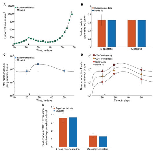 Model fits to data. (A) Model fitted to time-course treatment data on PCa xenograft volume, showing spontaneous emergence of castration resistance (black arrow indicates onset of ADT). (B) Model fitted to data on degree of apoptosis and necrosis in PCa xenografts, in the absence of treatment. (C,D) Model fitted to time-course treatment data on PCa xenograft immune cell infiltration (black arrow indicates onset of ADT). (E) Model fitted to fold-changes in TGF- expression within the xenografts 7-days post-ADT administration, and after the emergence of castration-resistance. Data were taken from [,,].